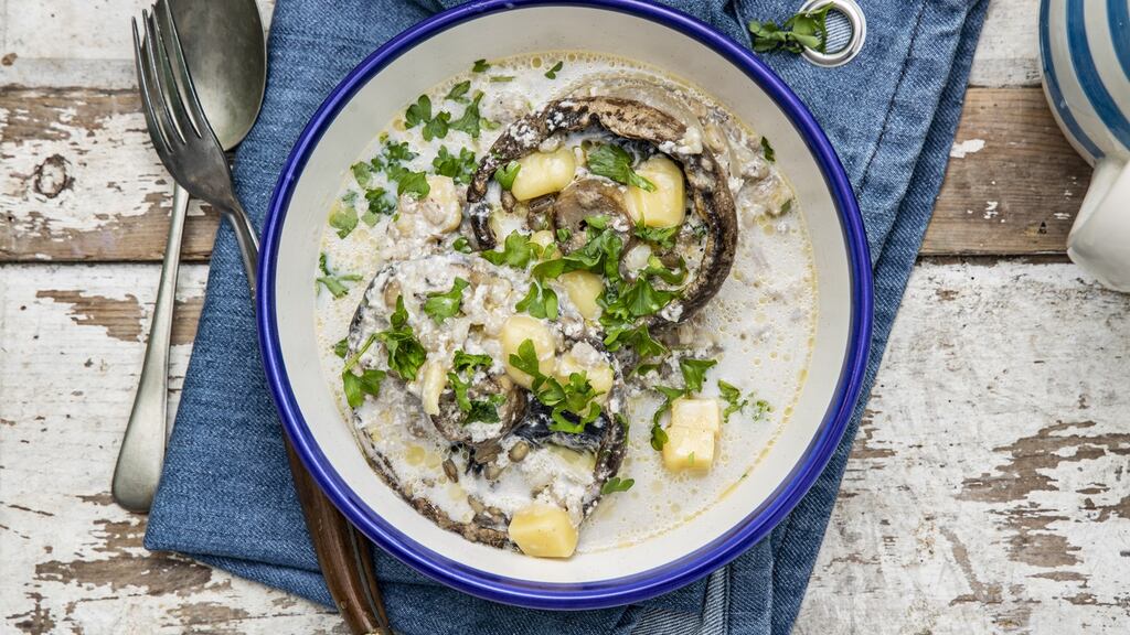 2. Put the mushrooms, onion, bay and rashers into a saucepan and cover with the milk.