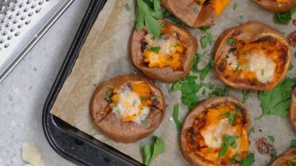 Mash the butter with the crushed garlic cloves and finely grated Parmesan. Turn each piece of sweet potato over and squash gently with a fork. Top with a little of the garlic butter.