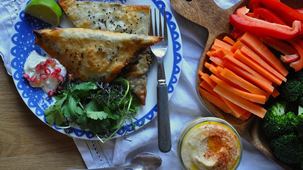 Preheat the oven to 200C. Cut each long sheet of filo pastry into a long rectangle. Lay one on the countertop and spoon 1/8 of the cooled filling into the top corner. Brush the pastry with water and fold it diagonally to create a triangle shape, continue to fold retaining the triangle shape and seal the dampened edges. Repeat with the remaining filling and pastry till you have made eight. Lay the samosas on two baking trays lined with greaseproof paper. Bake for 10 minutes then turn each one over. Brush each one with a little water and sprinkle with nigella seeds and return to the oven for a final 10 minutes till golden and crispy. Leave to cool for five minutes before serving with salad and hummus or yogurt.