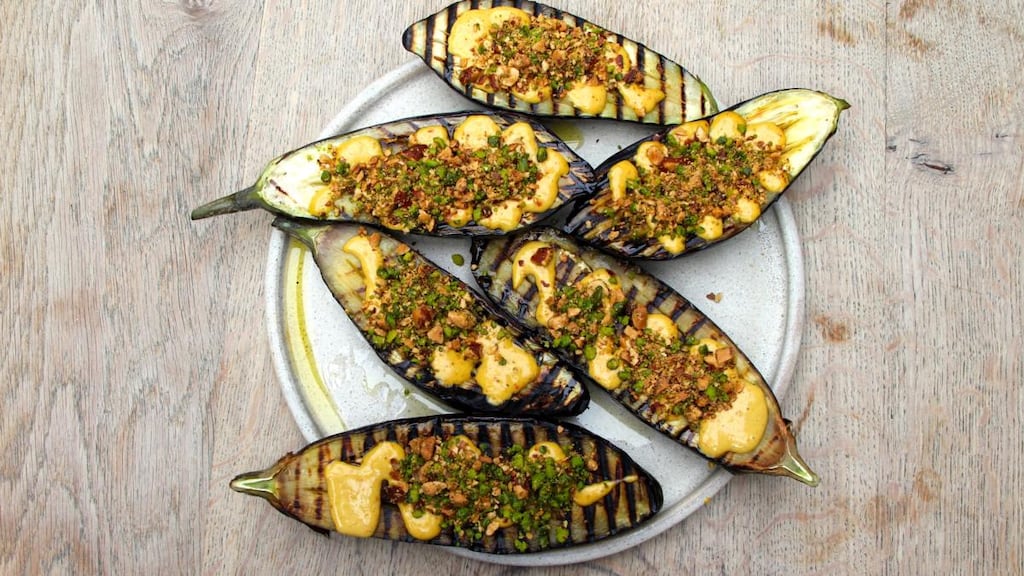 - 3 aubergines, halved lengthwise, then chargrilled or roasted