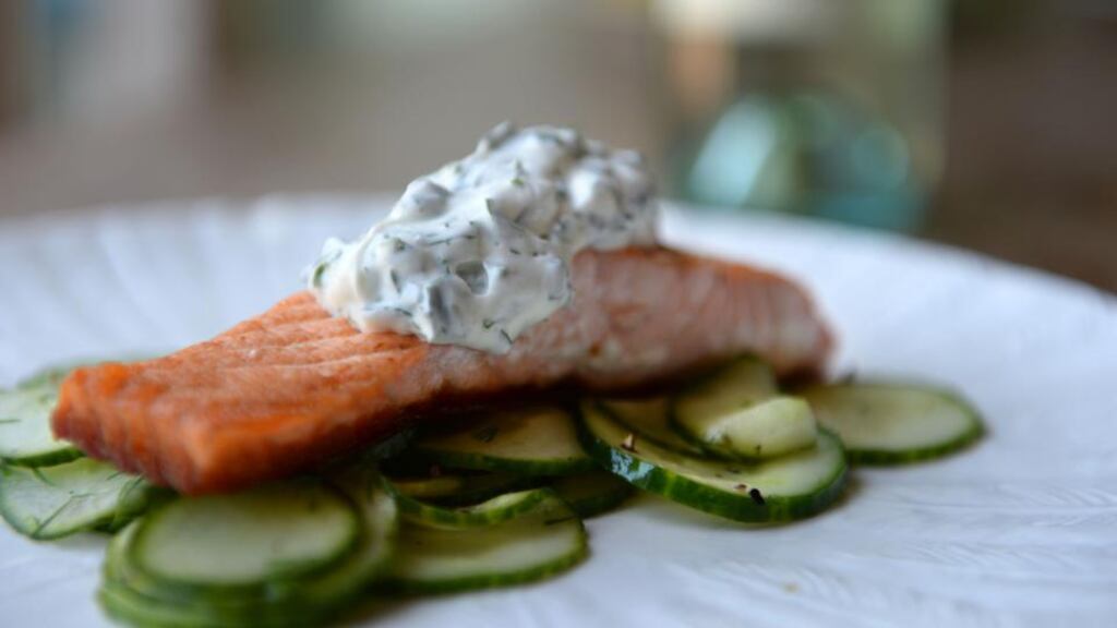 To serve, spoon some of the cucumber mixture on to a plate, place the salmon on top, and add a dollop of the herb yoghurt to finish.