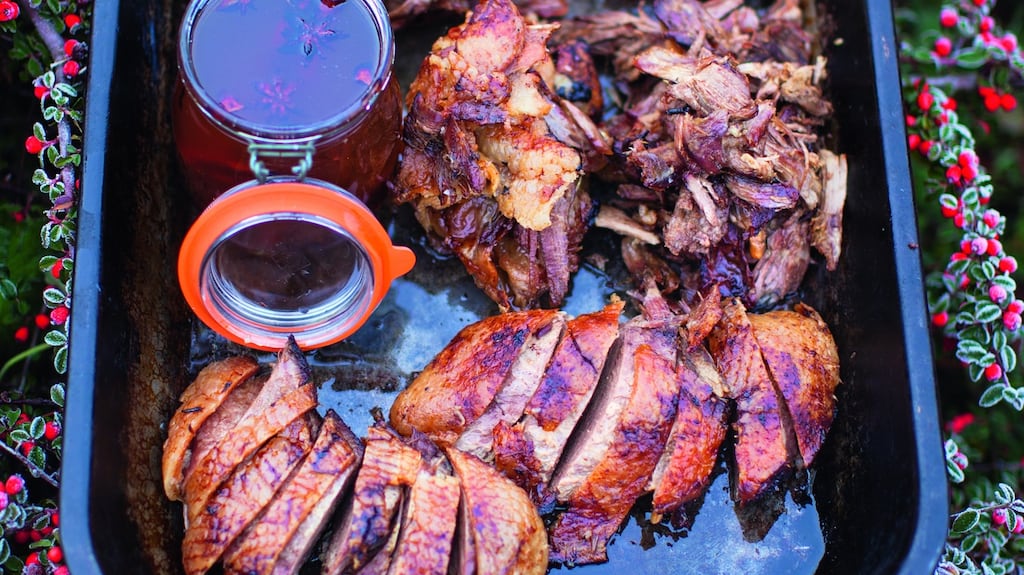 The goose is cooked when the leg meat falls easily off the bone. Now you’ve got two choices. Leave it to rest, covered, for 30 minutes, then serve up while it’s hot and crispy-skinned, in which case simply remove the meat to a board, shred the leg meat and slice the breast. Pour all the fat into a jar, cool, and place in the fridge for tasty cooking another day, such as roast potatoes. Stir a good swig of vinegar into the tray to pick up all the sticky goodness from the base, then drizzle over your meat. Serve with spuds, veg and all the usual trimmings.