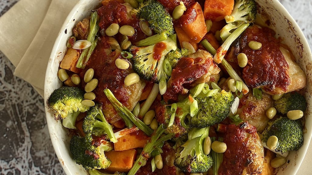 - Place the chopped sweet potatoes on to a baking tray and drizzle with a little oil. Place the chicken thighs on top. Roast for 15 minutes then top with the spring onions and broccoli florets.