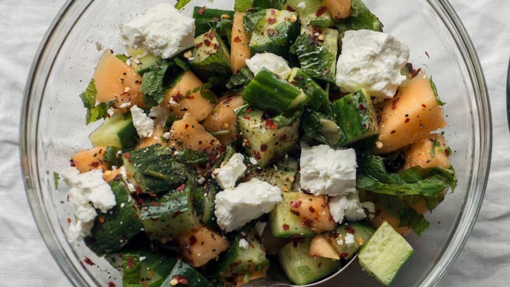 Cut the melon into slices, remove the seeds, scoop out the flesh and chop it up. Wash the cucumber well and cut in half lengthways, and again so you have long, quartered pieces, which you can chop into decent-sized chunks.