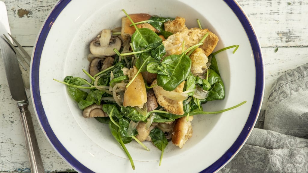 3. Cook for three to four minutes, then add the red wine vinegar, honey and finally the spinach. Season and turn the spinach through the mushrooms until it starts to wilt.