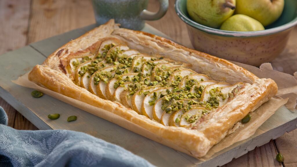 Brush the top of the pears with the remaining melted butter and sprinkle with the remaining sugar. Lastly, brush the edges of the pastry with beaten egg, sprinkle with pistachios. Bake for 25-30 minutes, or until the pastry is risen and golden.