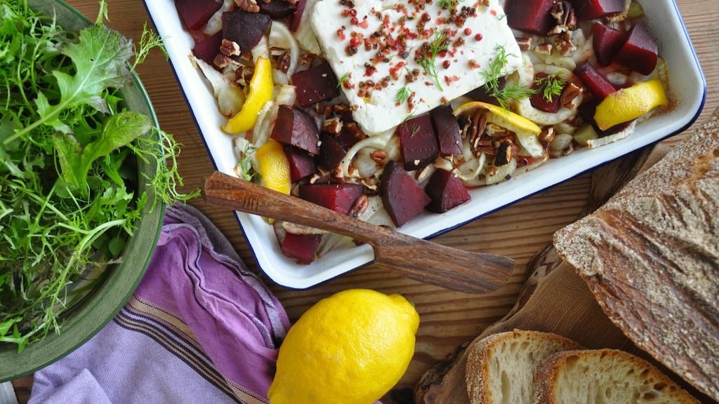 4. Place the block of feta on and scatter the pink peppercorns over the top along with a little olive oil. Return the tray to the oven for a further ten minutes. Once ready the cheese should be soft and the fennel starting to caramelise at the edges. Scatter the tray with the reserved fennel fronds and the toasted pecan nuts.