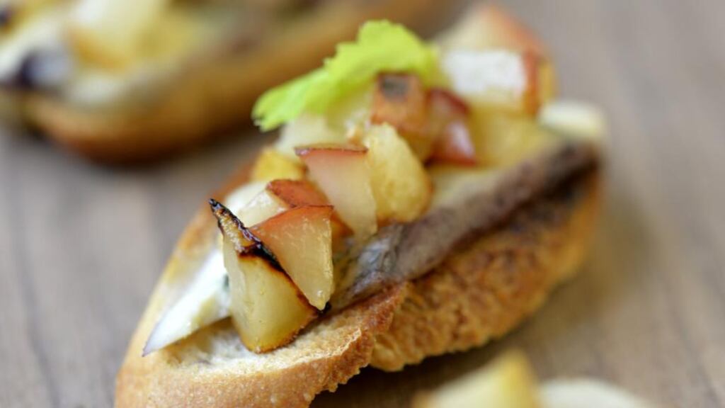 Toss the diced pear in a little oil with the sugar or honey, stir well, and grill under a high heat in a metal dish until very slightly charred. To serve, remove the cheese from the port (which you could use in a stew). Slice the marinated cheese and place on top of the slices of baguette. Pile a heaped teaspoon of the pear mixture on top and serve. I garnished with some celery leaves; coarse ground black pepper also works.