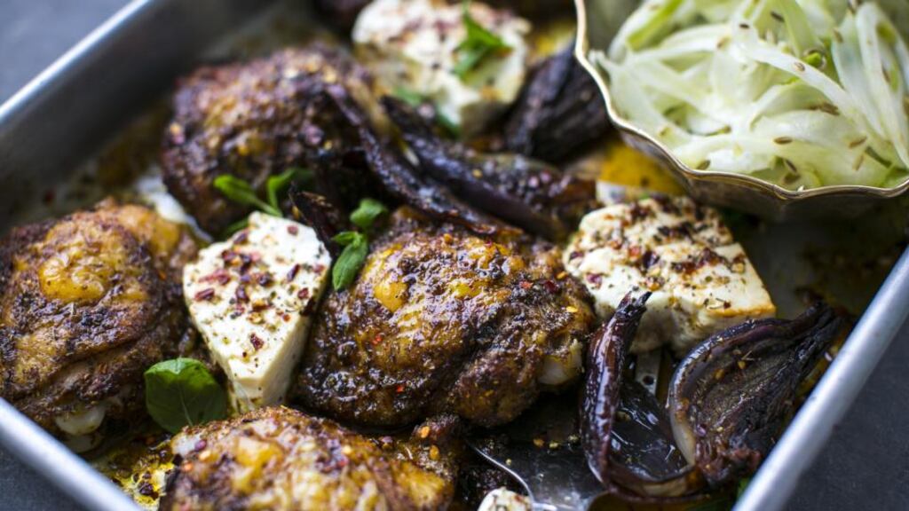 Place the chicken thighs and red onion on a large, flat, low-sided baking tin and drizzle them with oil. Sprinkle on the ras-el-hanout and season generously with sea salt and ground black pepper.