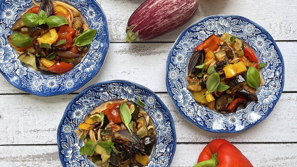 6 Fold the vegetables and half the herbs through the pasta and serve scattered with the remaining oregano.