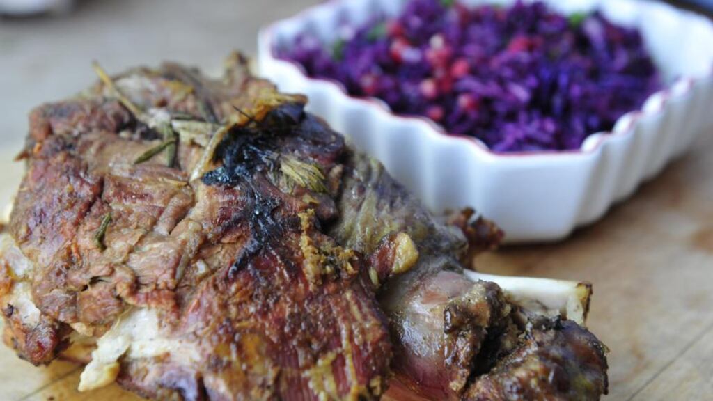 Slice or grate the cabbage in a food processor. Season well with salt and leave to wilt for at least 10 minutes. When that is done, dress the salad with olive oil and lemon juice to your taste (some like it sharper than others), before tossing with the pomegranate seeds, diced onion and fresh mint. Serve with the lamb.