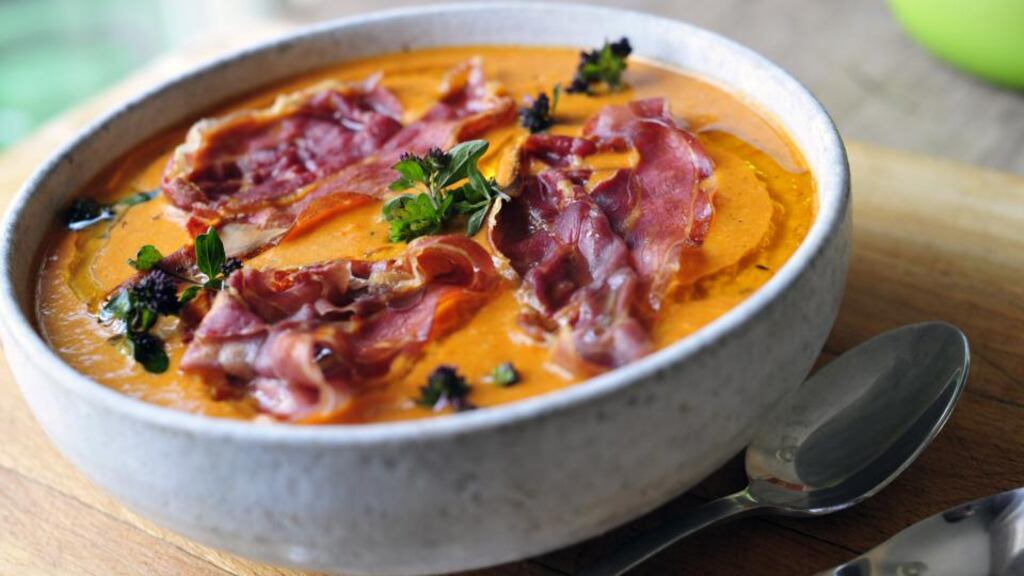 Meanwhile, grill the jamon till crisp. Pour the soup into bowls and garnish each bowl with the shards of jamon, some thyme and a good drizzle of your best olive oil.