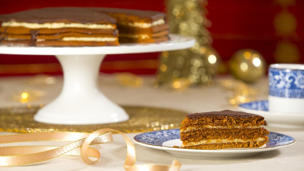 To make the biscuit layers, place the egg, sugars, butter, honey, milk and bread soda in a saucepan and beat together. Cook over a very gentle heat until it becomes foamy in texture and the colour is golden. This will take about 10 minutes. Remove from the heat and allow it to cool, and when cool, add the flour – you will then have a malleable paste. Line four baking trays with baking parchment. Divide the mixture into four equal amounts and spread in 8in circles. Bake for 6-8 minutes until the pastry is hard.