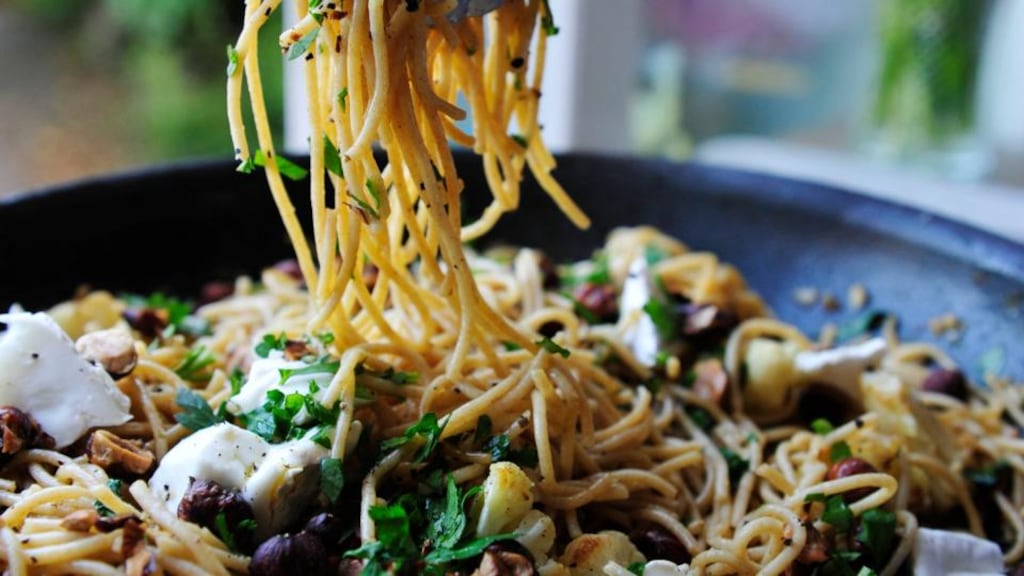 Meanwhile, heat up the butter, add the garlic and then the white wine and roughly chopped basil. Season and set aside. Cook your spaghetti in a large pot of boiling water, drain, then add the two tablespoons of olive oil and mix with a pasta spoon or tongs so the oil coats the spaghetti. Season with some salt and pepper. Put it back in the big saucepan and add the butter sauce and roasted cauliflower and toss. Spoon into bowls, and top with the hazelnuts and some grated cheese.