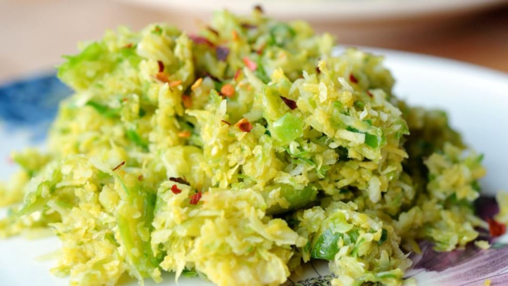 Melt the butter and add the stock/water and chilli flakes. When simmering, add the grated sprouts and, keeping the heat up, cook until they are tasty and just soft. The sprouts seem to absorb all the stock and cook just enough to retain all their flavour.