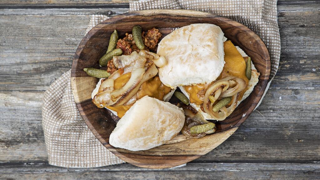 6. Spoon the meat mixture onto the baps and top with the onions, cheese and pickles.