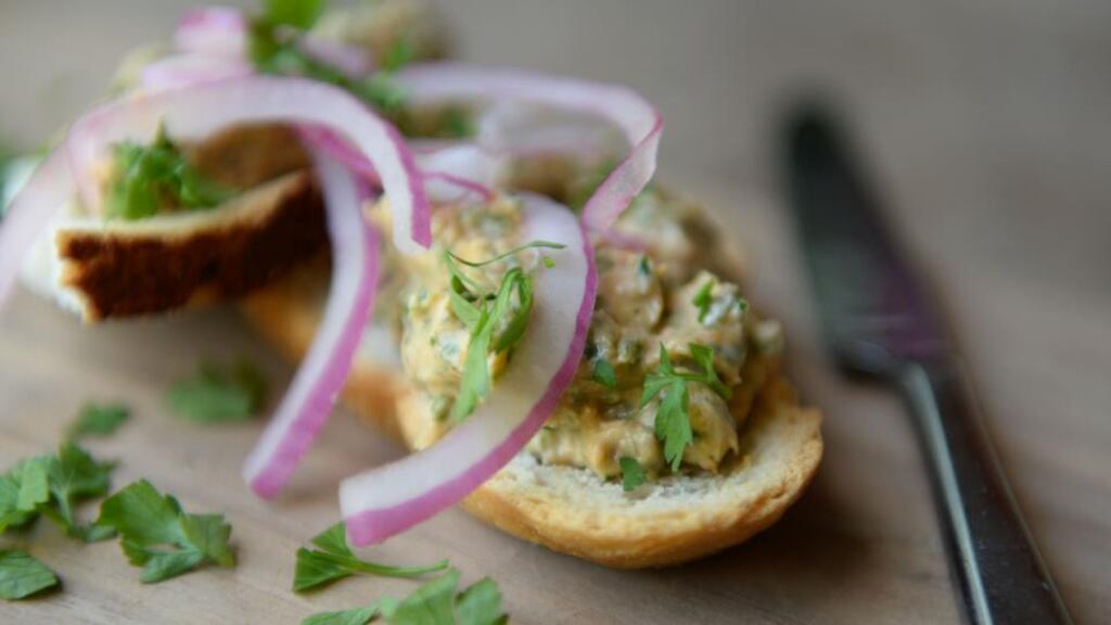 In a bowl marinate the onions in the vinegar and set aside for about half an hour. Next, in a blender, whizz together the remainder of the ingredients except the bread. To serve, either char the bread briefly on a chargrill pan, or toast it until golden. When the toast is cool, top with the mascarpone mix and garnish with the onions and a few capers.