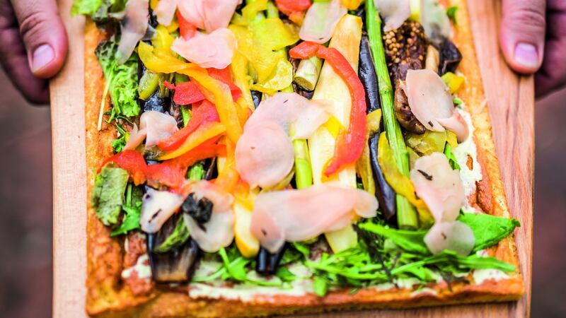 This is one of Juan’s dishes. It’s quite a common Spanish dish and very versatile - you can fill it with lots of different things. Here we roll up some roasted veg, rocket, Happy Pear mayo and pickled ginger. You could also use ketchup, or add some of your favourite cheese, grated.