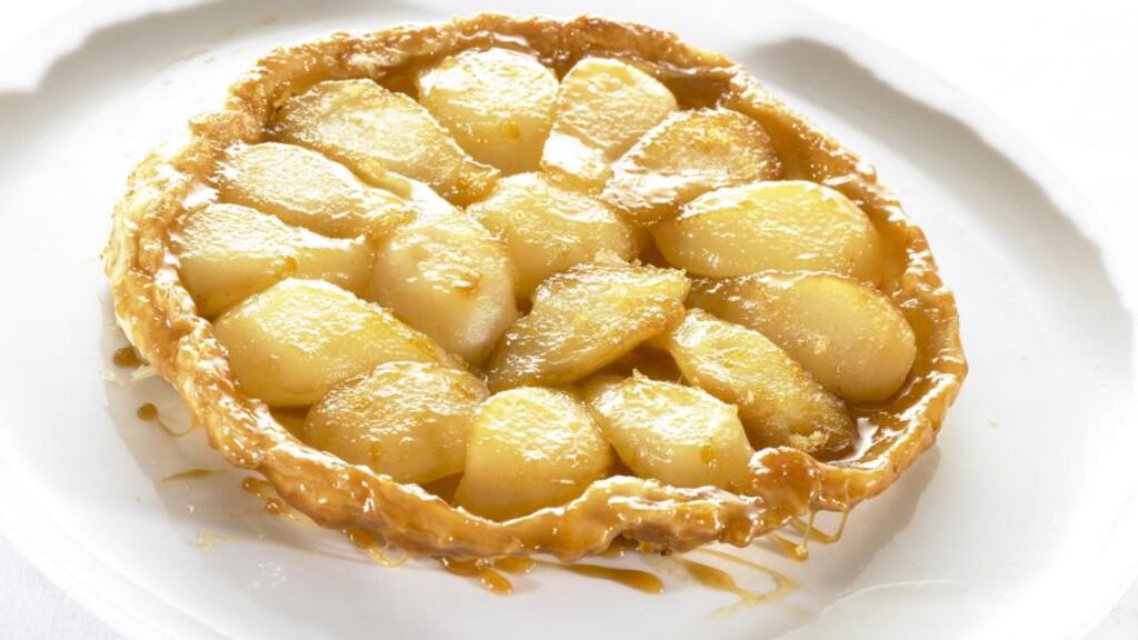 Remove from the oven and place a large plate on top of the pan/pie. Turn it upside down very quickly and remove the pan to reveal the tarte.