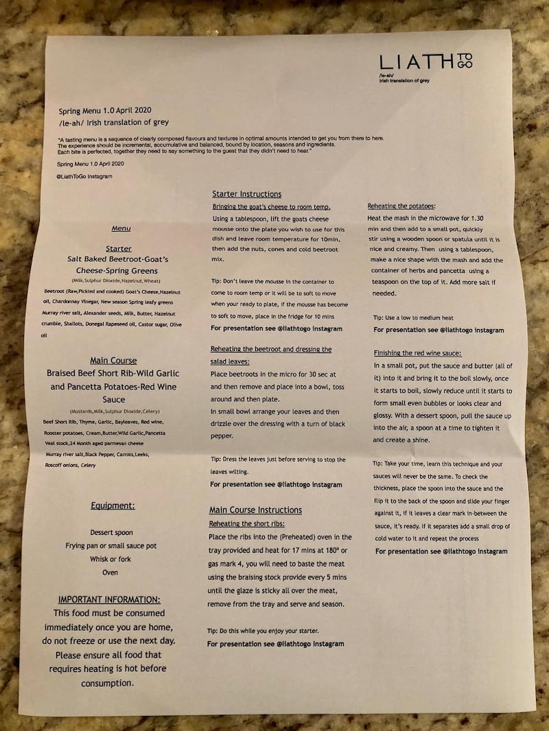 This evening the first takeaway meals from Liath, the Michelin one-star restaurant in Blackrock, in south Co Dublin, will be collected by the customers who purchased them online last Friday.