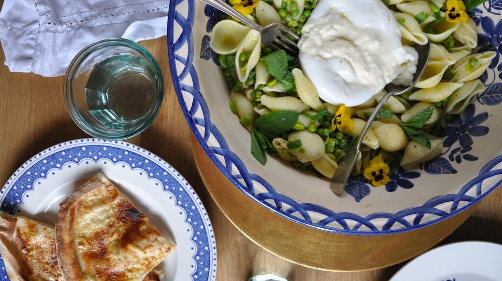 Once the peas and beans are cooked drain them over the sink and add to the warm pasta. Mix gently with the lemon juice and shredded mint leaves. Transfer to a serving bowl or platter, place the burrata in the centre and serve right away with the warm garlic breads.