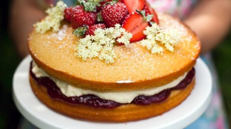 A Victoria sponge filled with fresh cream and strawberries, made smack bang in the middle of strawberry season, is possibly one of life’s greatest treats. The version I share with you also makes the most of another of early summer’s great spoils, elderflower. Here, in the form of cordial, it spikes the cream with its uniquely floral tang and sweetness.