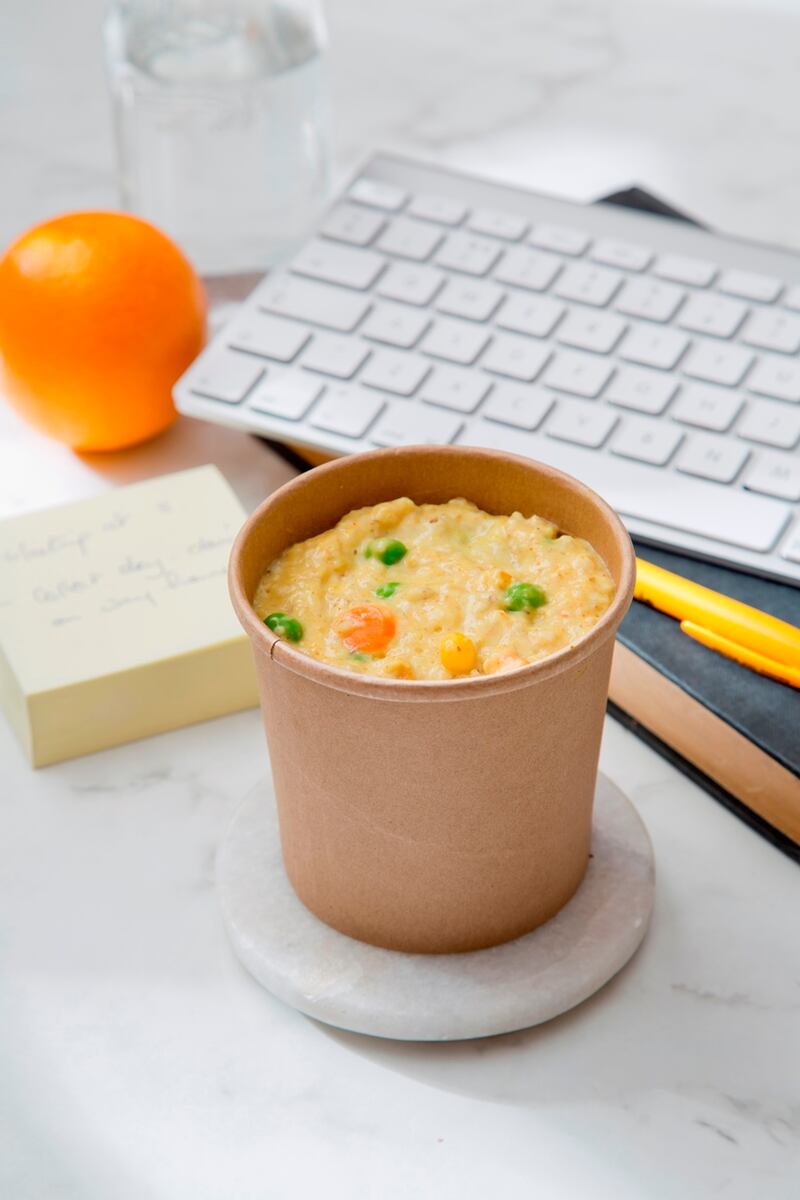 1. In a microwaveable mug or bowl, add water, oats, vegetables, spices and sriracha sauce and mix well