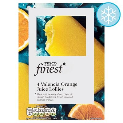 Marks & Spencer’s Valencia Orange Juice Lollies, which are another good option, are smaller, but each one has 68 calories. That’s because it is made up of “freshly squeezed” orange juice (87 per cent) and sugar. That added sugar makes all the difference. Funnily enough, Tesco’s Finest Freshly Squeezed Valencia Orange Juice Lollies also have 87 per cent “freshly squeezed Valencia orange juice” and sugar.