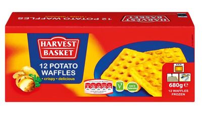 Lidl’s Harvest Basket waffles have very similar ingredients, but taste a lot more potatoey to me. They comprise 87 per cent potatoes, 7 per cent sunflower oil, reconstituted potato flakes, rice flour, salt, dextrose and hydroxyl propyl methyl cellulose.