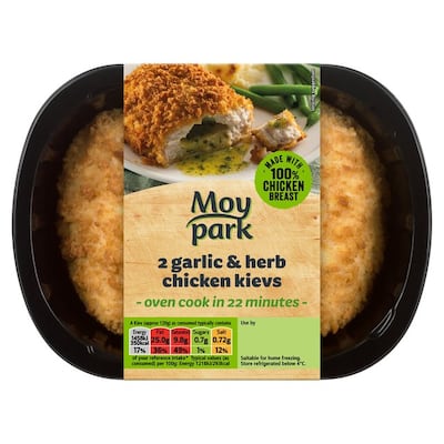 A packet of Chicken Kiev from Moy Park has more chicken at 55 per cent and few processing aids, but uses rapeseed oil and margarine as well as butter.
