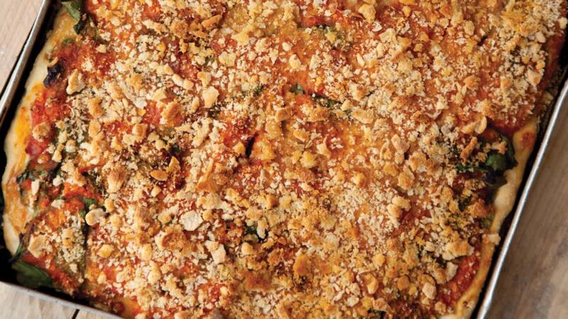 - Turn the dough out onto a lightly floured surface. Knock it back and knead for about 3 minutes, then stretch the dough out to fit the baking tray (it should be thicker than a traditional pizza). Scatter over the pancetta, cheese and spinach and then spoon over the tomato sauce, then sprinkle with the breadcrumbs and oregano.