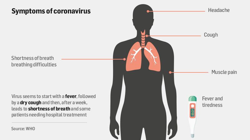 If you’ve come back from one of the affected areas and you have symptoms, contact your GP urgently, and do not leave the house. The principal symptoms are headache, dry cough, shortness of breath, muscle pain and fever. If you have come back from these areas and are feeling well the advice is to consult the HSE website, or ring the HSELive helpline on 1850 24 1850 for advice.