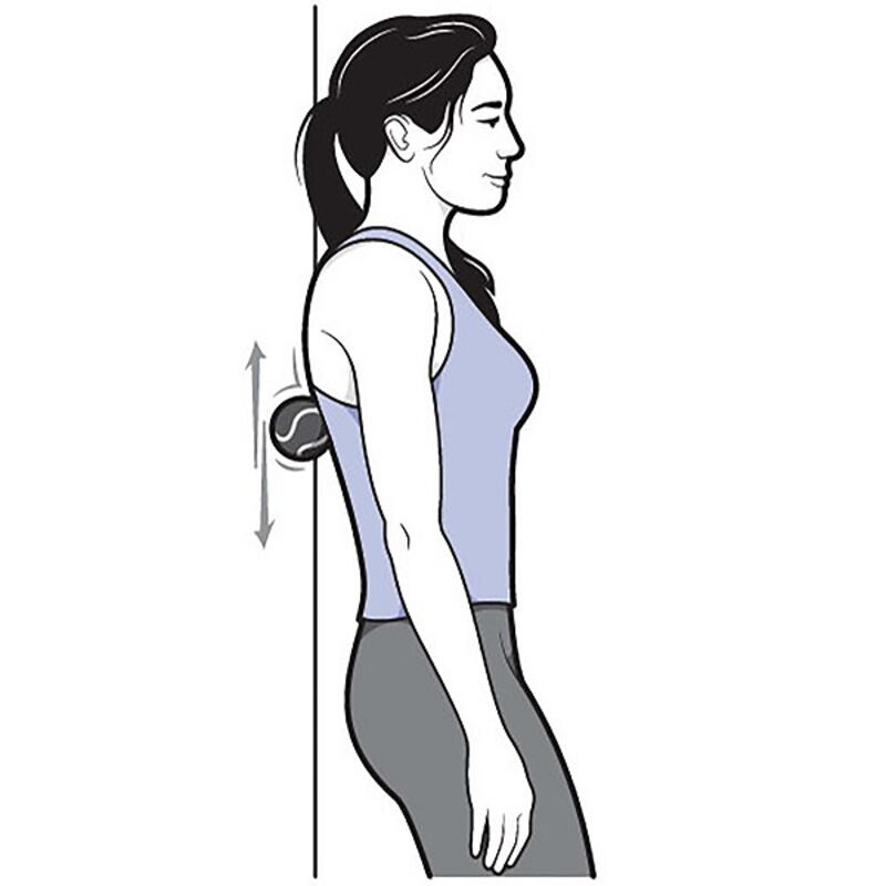 Upper back roll Turn so your back faces the wall. Place the ball at the top of your trapezius, the upper back muscle, and lean into the wall. Gently roll the ball along the outer edge of the shoulder blade by bending and straightening the knees and then lifting and lowering the heels.