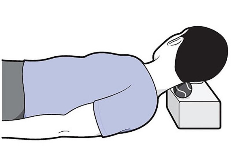Neck release Come down onto your back with a yoga block or thick book under your head. Turn your head to the right and place the ball on your upper neck behind your ear. Take five deep breaths.