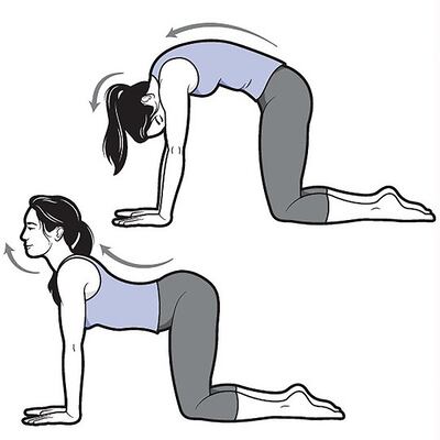 Cat/Cow Come into a tabletop position on the floor, with hands under shoulders and knees under hips. As you inhale, drop the belly, press the chest forward and look up. Exhale, tuck the chin toward the chest and round the spine. Flow between these cow and cat yoga positions for three to five breaths, following your breath.