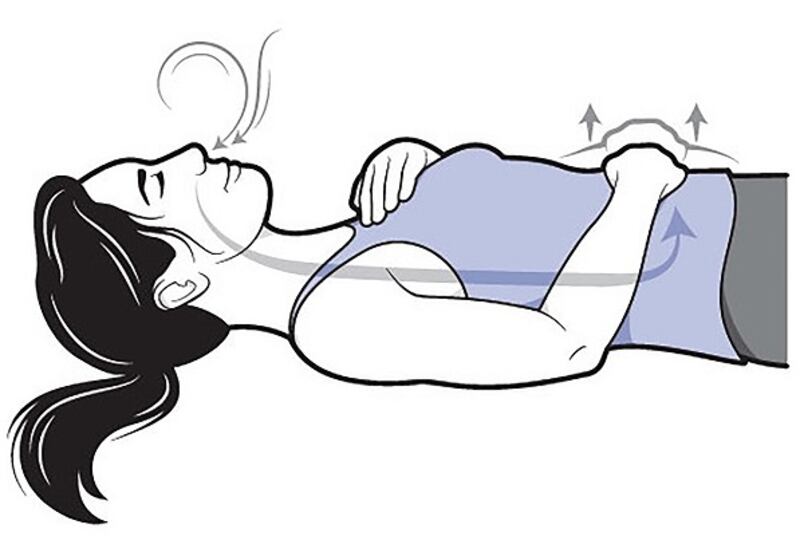 Belly breathing Lie flat on your back with your knees bent. Place one hand on your chest and the other on your belly just below your rib cage. Breathe in slowly through the nose so your stomach expands against your hand. The hand on your chest should not move.