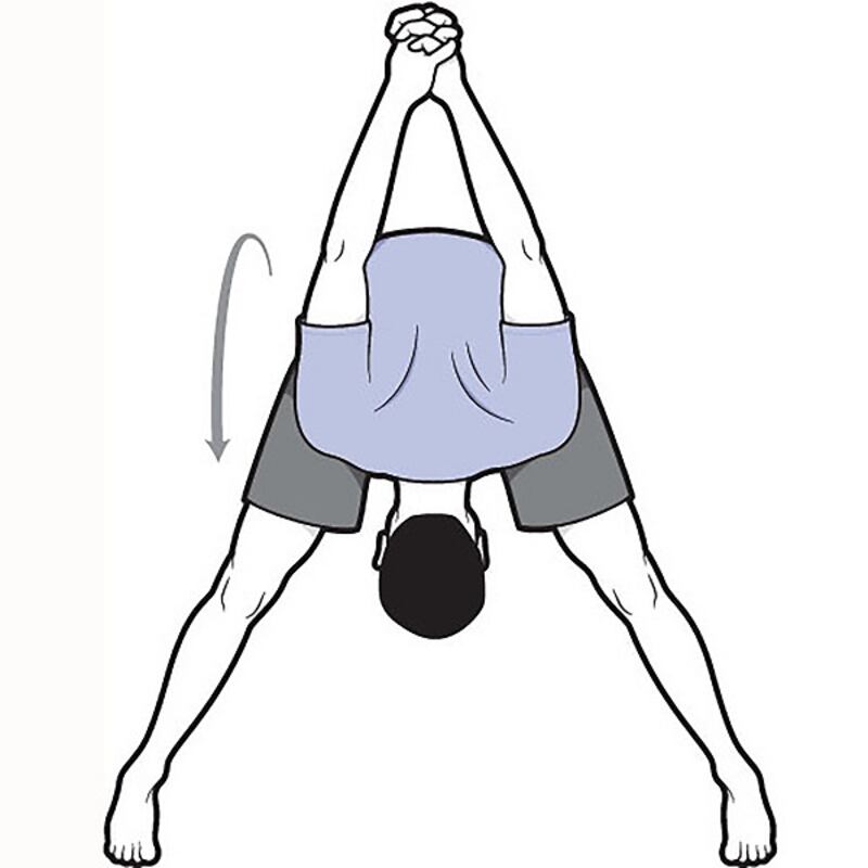 Wide-legged forward fold Stand with your feet wider than hips distance, typically about 4ft apart. Turn your toes in. Interlace your hands behind your back. Inhale, open the chest and bring the palms closer together. As you exhale, fold forward and allow your arms to hang overhead.