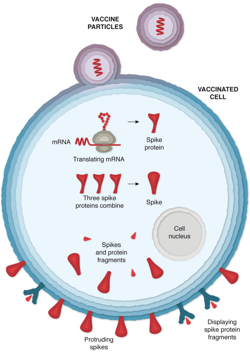 After injection, the vaccine particles bump into cells and fuse to them, releasing mRNA. The cell’s molecules read its sequence and build spike proteins. The mRNA from the vaccine is eventually destroyed by the cell, leaving no permanent trace.