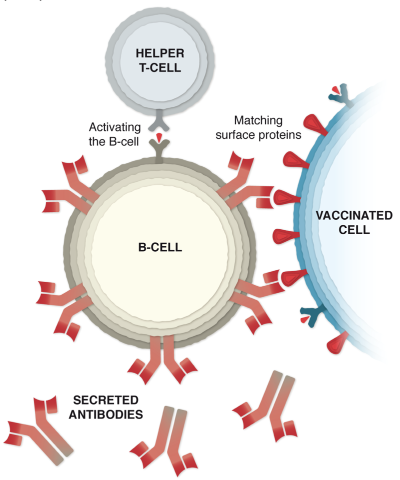 Other immune cells, called B-cells, may bump into the coronavirus spikes and protein fragments on the surface of vaccinated cells. A few of the B-cells may be able to lock on to the spike proteins. If these B-cells are then activated by helper T-cells, they will start to proliferate and pour out antibodies that target the spike protein.