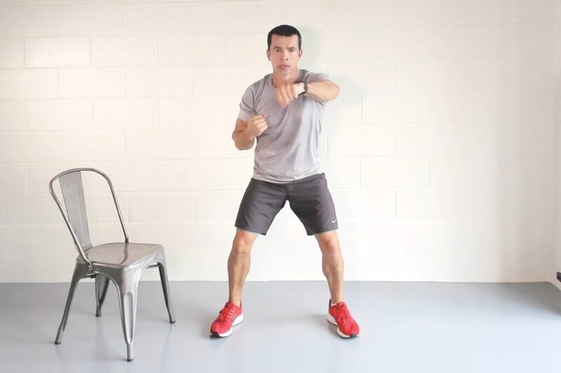 5) Stand and box: (30 seconds) – Place your feet shoulder-width apart. Now raise your fists and punch and jab the air like a boxer. The goal here is to get your heart rate up. Punch a bit faster and add a squat if you'd like to make it harder.