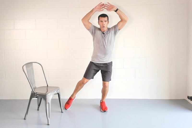 6) Chair-assist split squat: (30 seconds) – Stand next to the chair with one leg forward and one leg back. Drop the back leg to the ground and use the chair for balance if you need it. Keep the front knee behind your toes. Switch legs after 15 seconds.