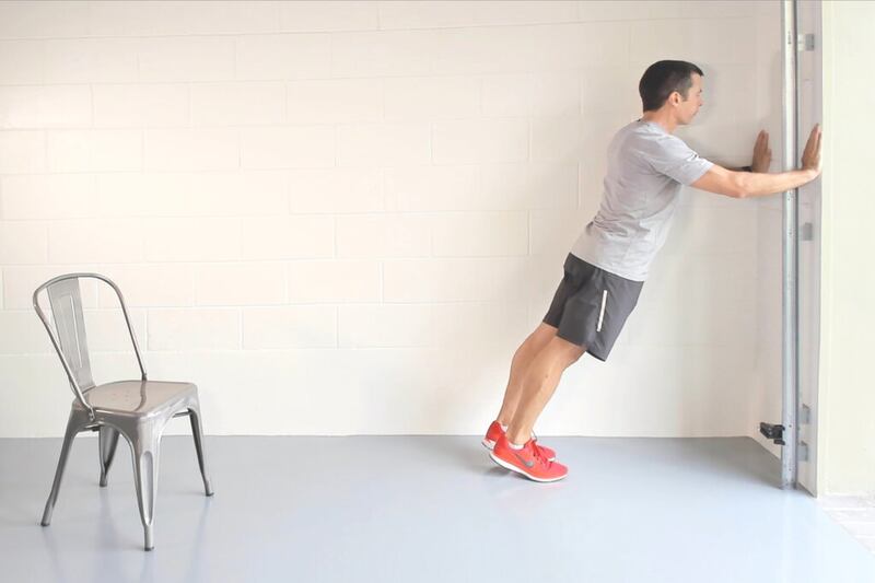 3) Wall pushup: (30 seconds) – Place your hands against the wall and walk your feet back so you're leaning at a comfortable angle. Keep your body straight from head to heel, and lower yourself toward the wall and push up against it. If it's too hard, scoot your feet closer to the wall. If it's too easy, move your feet farther from the wall.