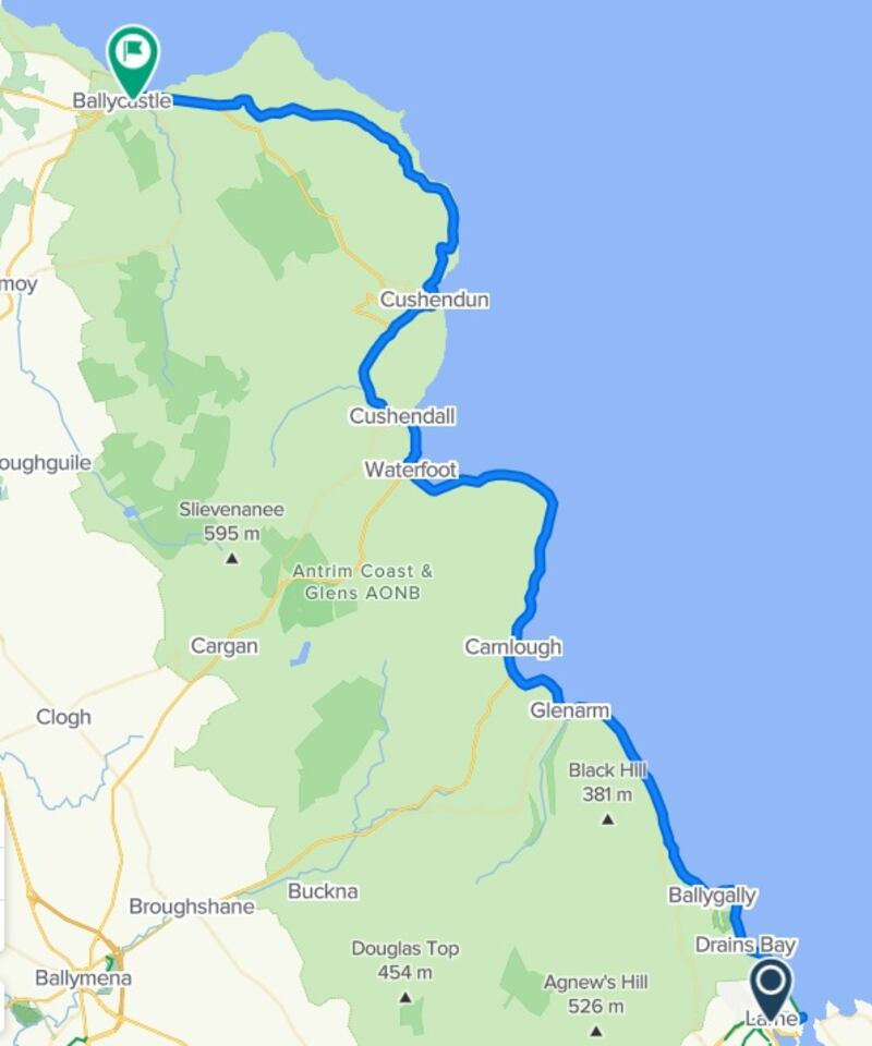 Route: A rural winding road that hugs the coastline, sea views on one side and rugged steep hillsides on the other, passing through Ballygally, the village of Cushendall, then you across moorland and mountains into Ballycastle.
