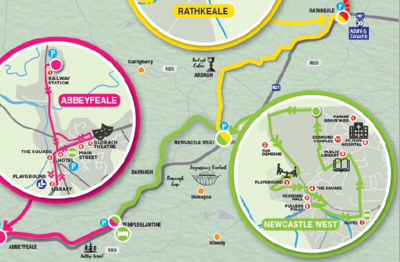 Route: Also known as the Limerick Greenway, a fully off-road cycling and walking route in five sections along part of the old Limerick-Tralee railway line that connects the three market towns of Rathkeale, Newcastle West and Abbeyfeale in West Limerick.