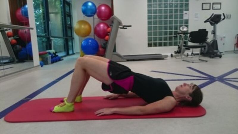 In order to strengthen your gluts you can do a simple bridge exercise. Lie on your back, bend your knees, squeeze your buttocks and lift your hips up off the mat – your shoulders hips and knees should be in a diagonal line and you should not be arching your back. Keep your pelvis level and aim to hold this for 5-10 seconds .Repeat this eight to 10 times as a starting guide. If your hamstrings (back of your thighs) start to cramp just rest until it subsides. This is often a sign that your gluts muscles are weak so even more of a reason to kick start them into action.