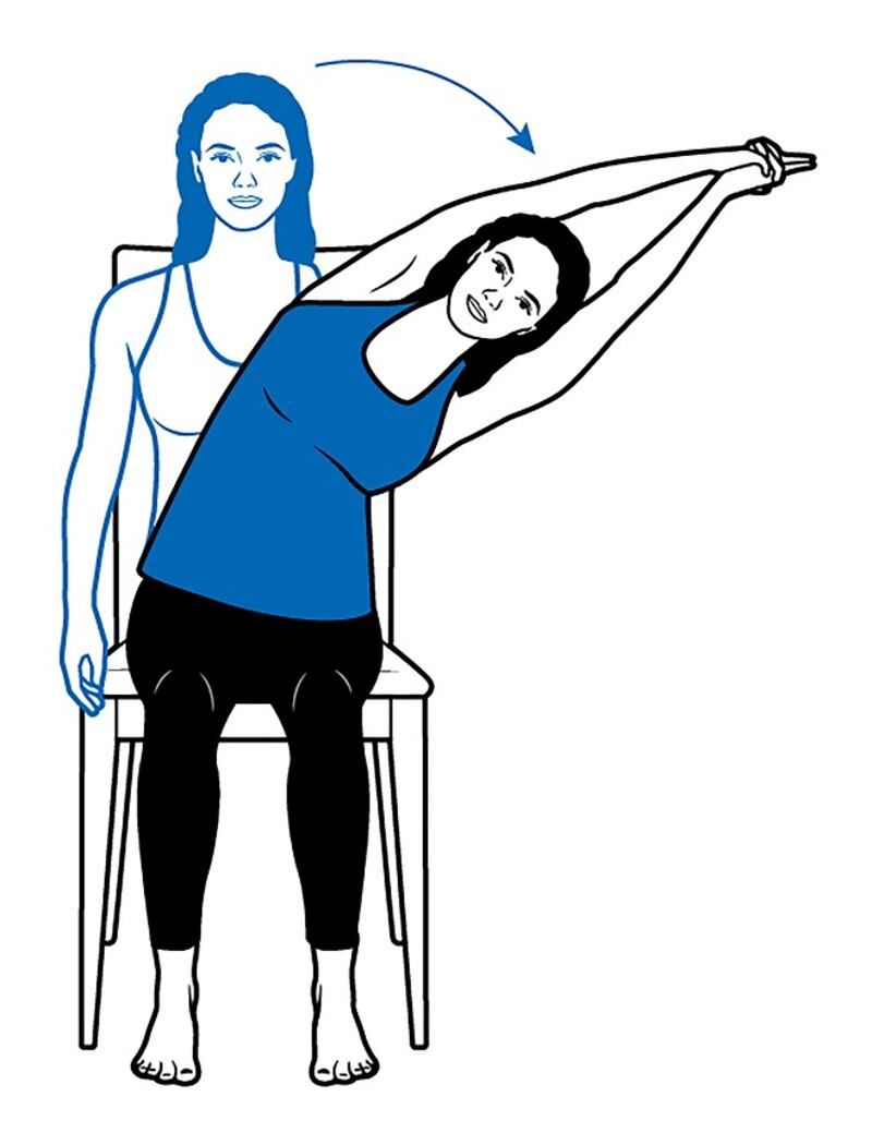 Hold the stretch for five breaths, inhale to centre, switch your hands, exhale and bend to the left. Hold for five breaths. Inhale back to centre, release the grip on your hands, exhale and twist to the right, letting your hands fall to the outside of your thigh or chair.