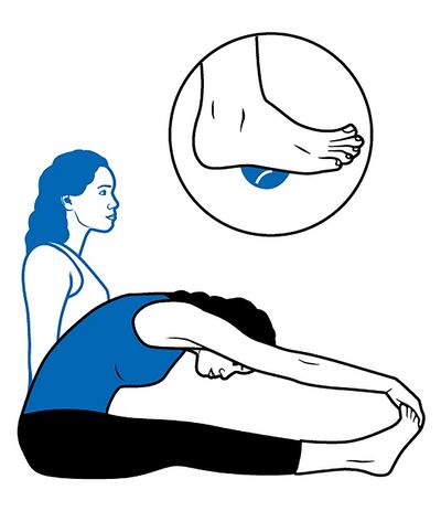 When you massage the bottoms of your feet, you start to loosen connective tissue that runs up the back of your body, including in the calves and hamstrings. To see how quickly this works, sit on the floor with your legs extended and feet flexed. Exhale, fold forward with a flat back and walk your fingers forward alongside your legs, as far as you can go. Notice the point where your hands land. Now, forget about your hands but stay on the floor and place a tennis ball or something similar under the ball of your foot.