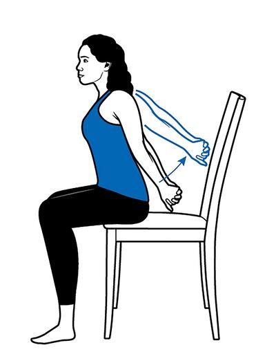 For another seated stretch to help you open your shoulders, release tight chest muscles and combat poor posture, scoot to the edge of your chair or stool, extend your arms behind your back and interlace your fingers. Try to keep the palms together and actively roll your shoulders back and puff up your chest. To deepen the stretch, start to lift your clasped hands. Hold the stretch for up to a minute.