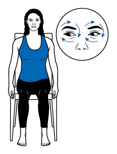 Sit up straight and look down to your right, roll your eyes toward the sky, then to the left and down back to the ground. Then roll your eyes in the opposite direction.