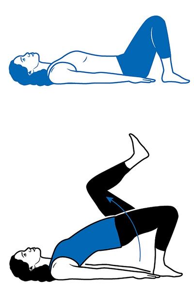 Begin by lying on your back, with your knees bent and your arms by your side. Your feet should be hip-width apart and 10 to 12in from your butt. Squeeze your glutes and lift your hips up into a bridge position. Hold here while you lift your right foot off the ground, bringing your knee towards your chest until your hip is at a 90-degree angle. Lower your right foot to the ground and repeat on the left.